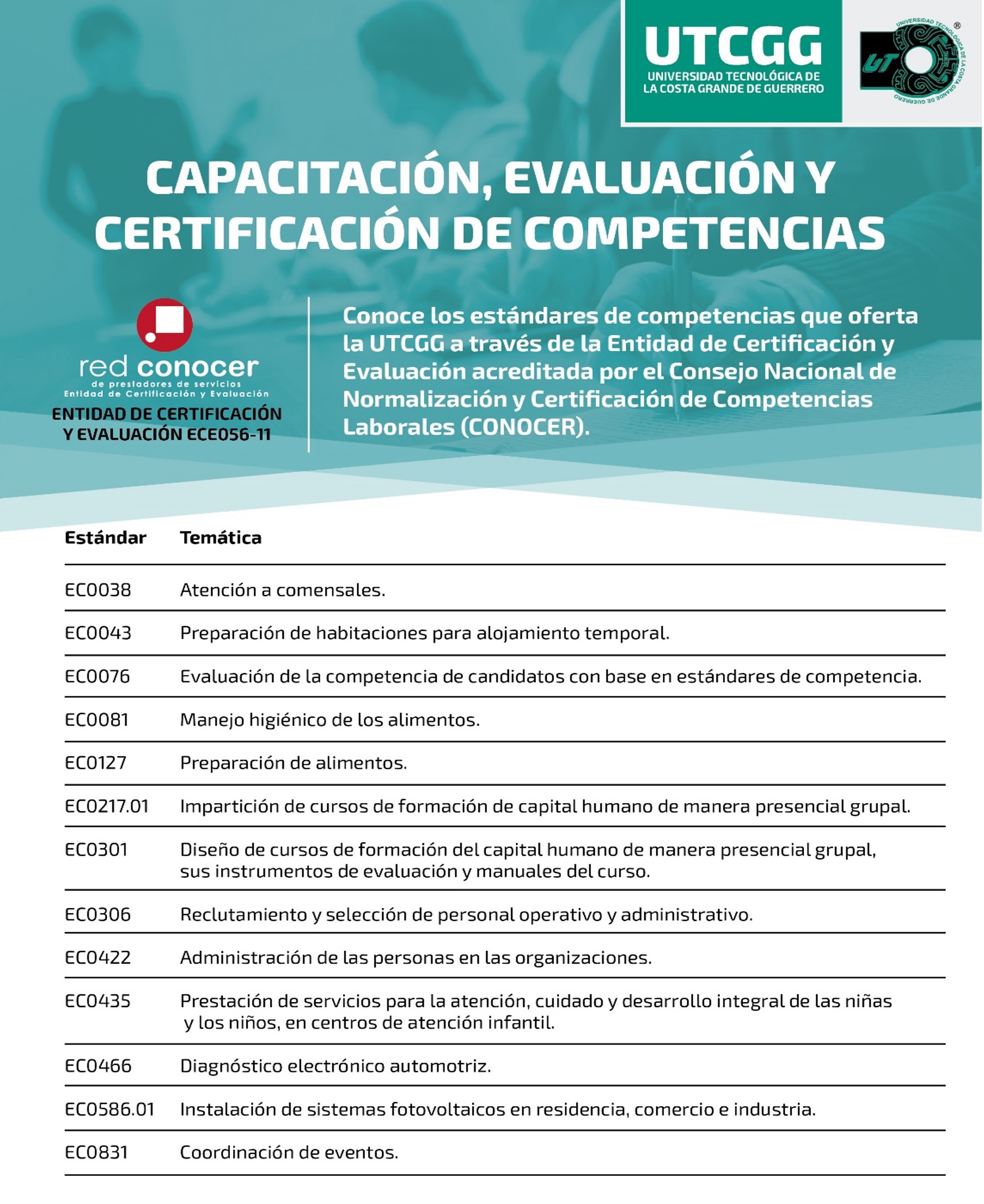 Conoce los estándares de competencia que oferta la UTCGG a través de la Entidad de Certificación y Evaluación acreditada por el Consejo Nacional de Normalización y Certificación de Competencias Laborales (CONOCER)